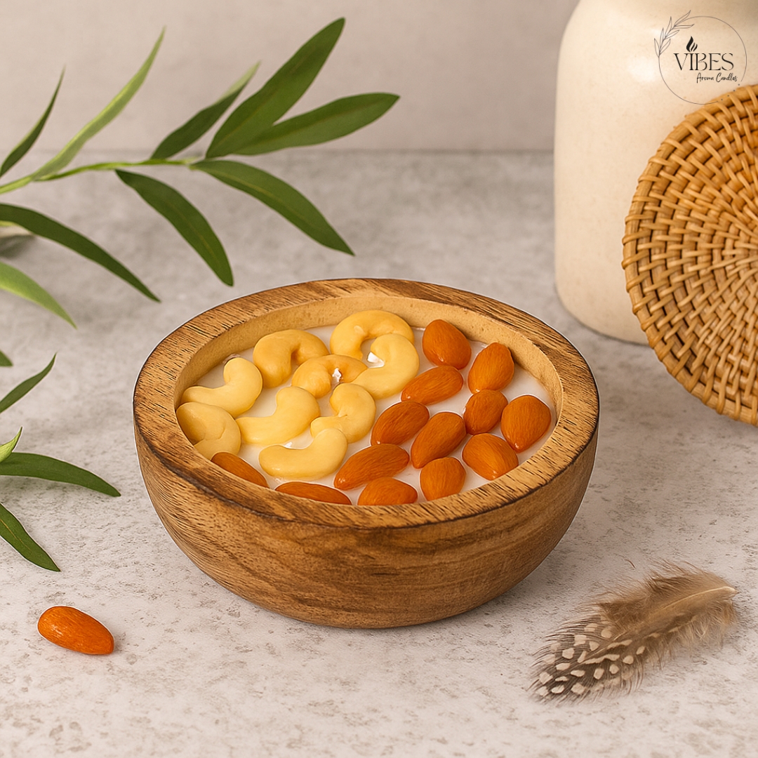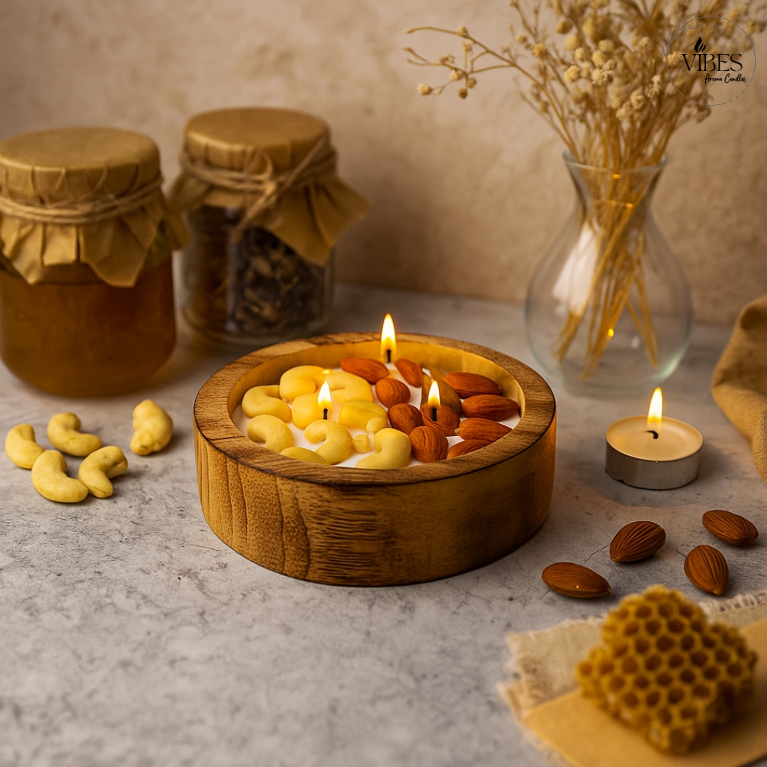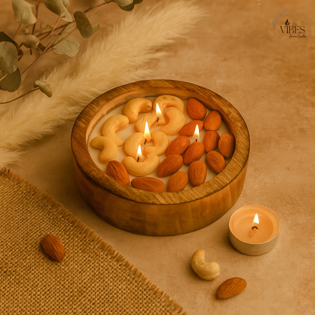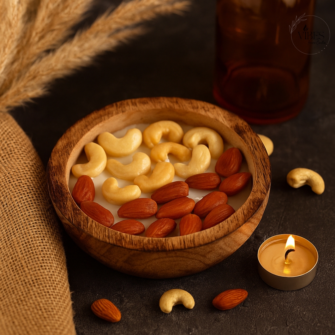 Dry Fruit Bowl Candle – Premium Soy Wax with Almond & Cashew Design | Festive Wooden Candle Gift
